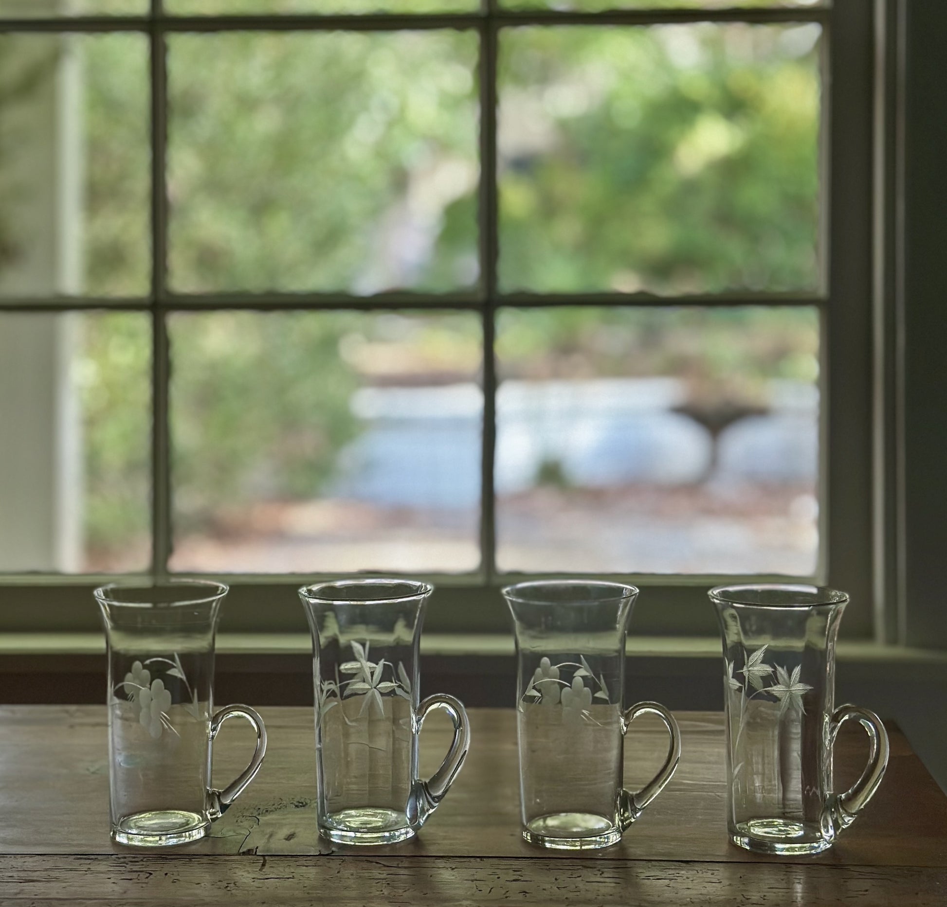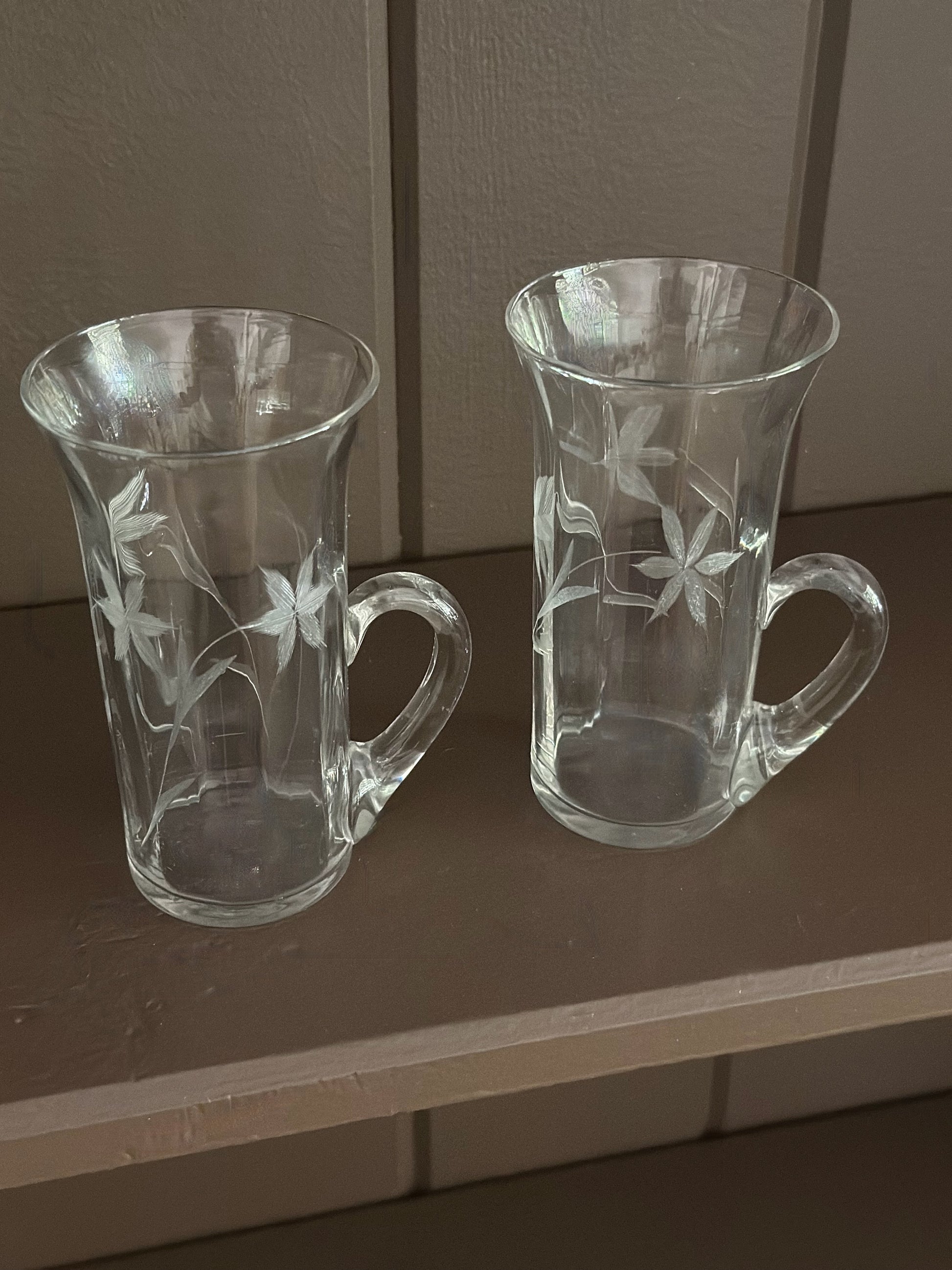 Vintage etched Irish coffee mugs with handles. Three have a rounder etched flower and thicker handle. Two have a thinner handle and different flower.